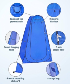 A hordozható kemping zuhany sátor tökéletes kiegészítője szabadtéri kalandjainak. Ez a sátor kényelmet és biztonságot nyújt, amikor zuhanyzásra vagy öltözésre van szüksége kempinghelyeken, strandokon vagy más távoli helyeken. Könnyű beállításának és lebontásának köszönhetően ez a sátor ideális utazóknak és kalandoroknak, akik értékelik a kényelmet és a magánéletet.