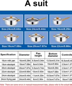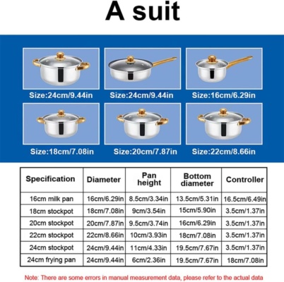 Termék méretei: 16 cm/6,3 hüvelyk (tejeskanna), 18 cm (7,09 hüvelyk)/20 cm (7,87 hüvelyk)/22 cm (8,66 hüvelyk)/24 cm (9,45 hüvelyk) (leveseskanna), 24 cm/9,45 hüvelyk (serpenyő)
