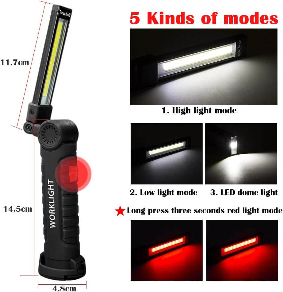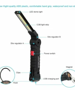 🔦A munkalámpa könnyű, tartós, vízálló és ütésálló ABS hőre lágyuló műanyagból készült.