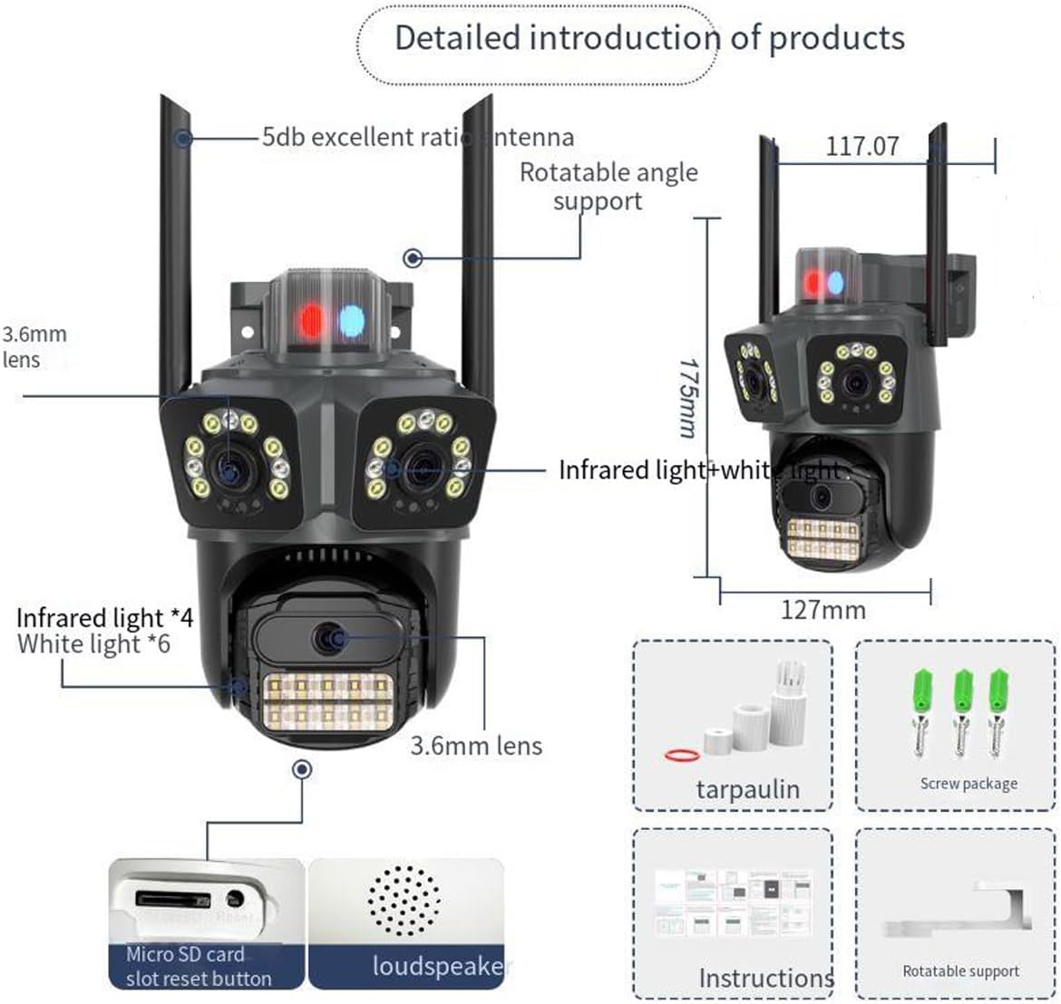 ✔️A legújabb technológia megtestesítője, a Triple Surveillance Camera teljesen újradefiniálja a biztonság észlelését és kezelését. A funkciók és a fejlett funkciók lenyűgöző választékával ez a kamera több, mint egy egyszerű megfigyelőeszköz – ez egy teljes és hatékony biztonsági rendszer, amely készen áll arra, hogy magabiztosan megvédje minden szögből és minden pillanatról.
