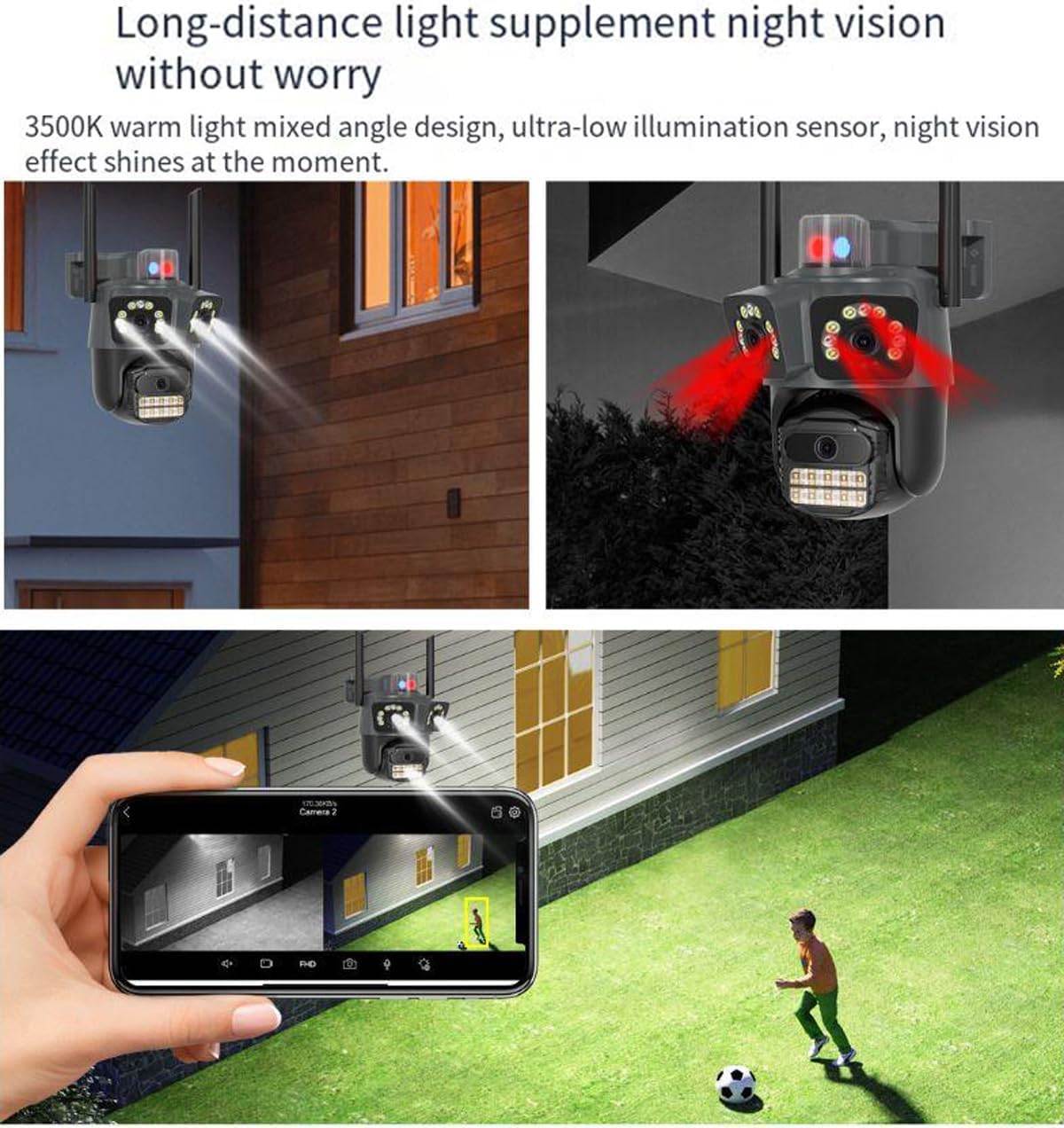 ✔️Három objektív három képernyővel: A három ultra-nagy látószögű objektívet 128.87 × 138.97 × 225.23 mm integráló innovatív kialakításnak köszönhetően a megfigyelési környezet teljes lefedettsége valósággá válik, biztosítva, hogy egyetlen szög se vesszen el a szem elől.