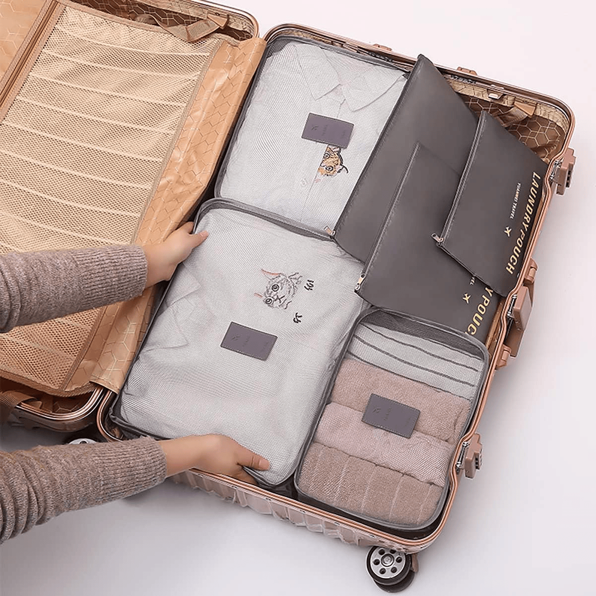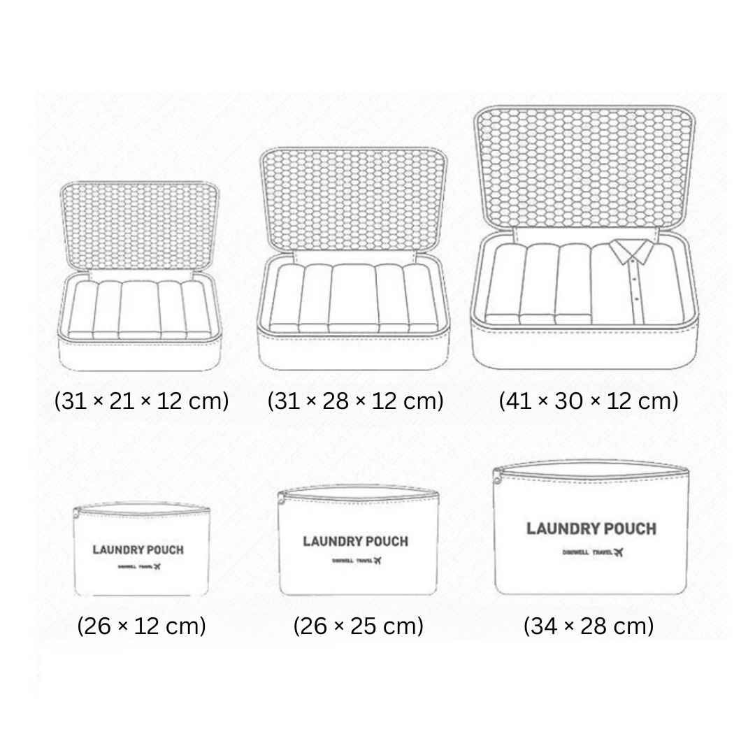 ✅Egy hat darabból álló utazószervező készlet, amely tökéletesen megfelel minden szükséges dolog, például fehérnemű, cipő, ruházat vagy kozmetikumok csomagolására, valamint a mosandó fehérnemű tárolására.