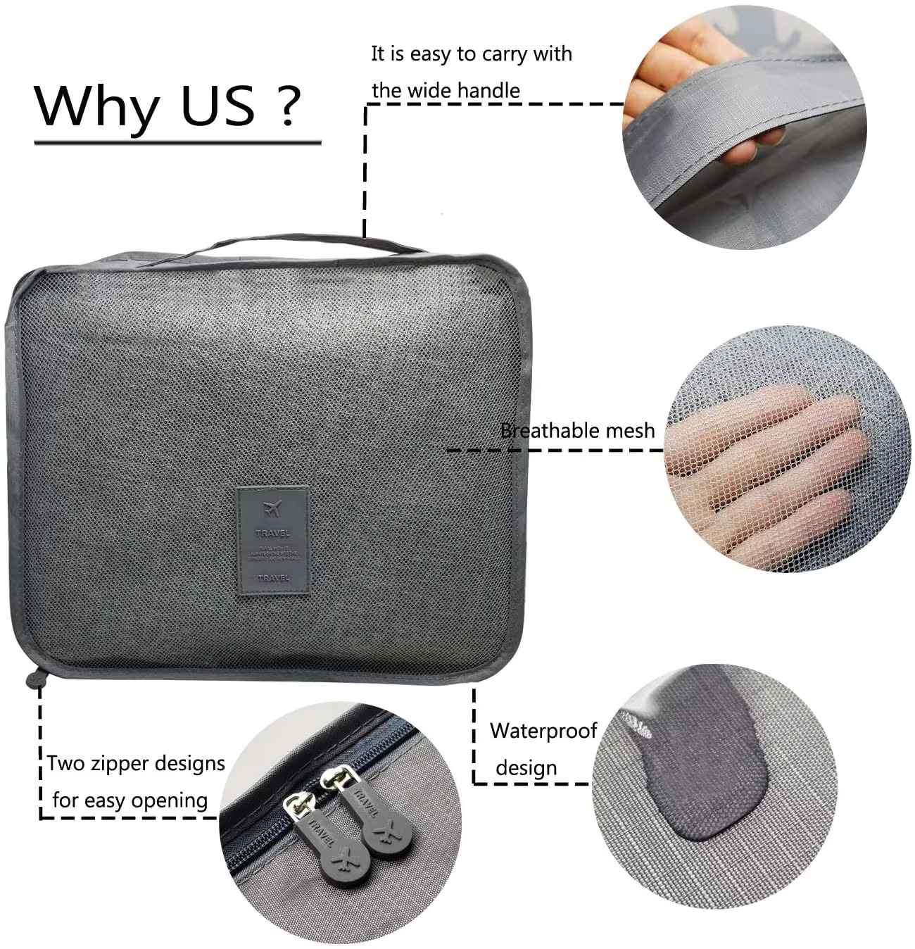 ✅A táskák különböző méretűek, így könnyen rendezhetőek az utazáshoz szükséges dolgok. A három legnagyobb táska kétoldalas cipzárral, hálós fedéllel a jobb szellőzés érdekében és kényelmes fogantyákkal van ellátva. A kisebb tasakok átlátszatlan anyagból készültek, cipzárral, tökéletesek a mosnivaló és egyéb szükséges kiegészítők tárolására.