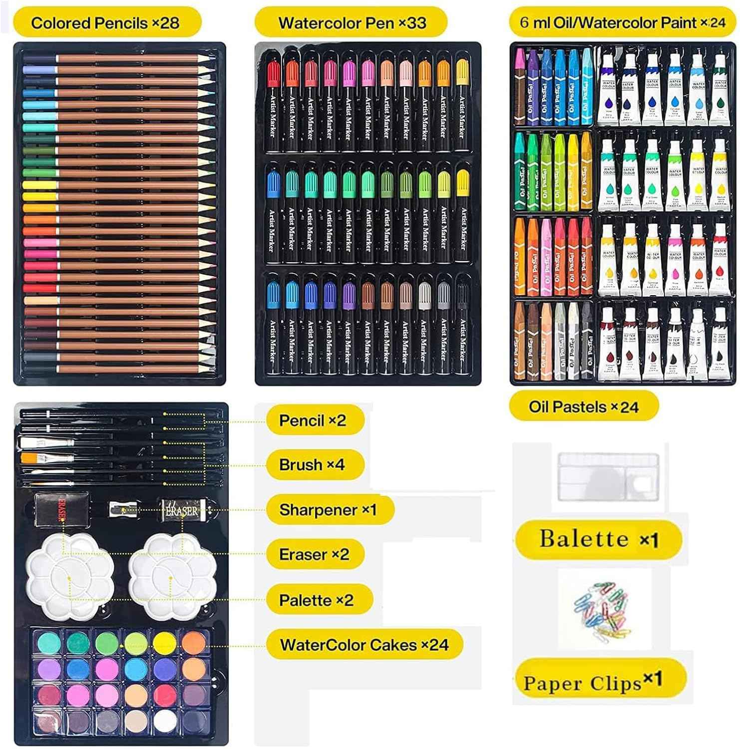 ✅A rajzolás és festés nagyon kreatív tevékenység, amely fejleszti a képzelőerőt, azonban ahhoz, hogy elképzeléseit megvalósíthassa és papírra vethesse, megfelelő festőeszközökre van szüksége. A készlet 145 elemből áll, amelyek között megtalálható: