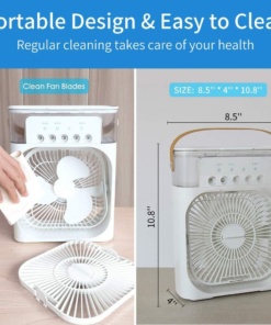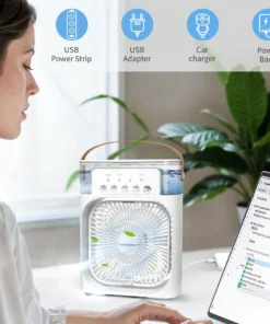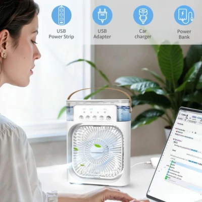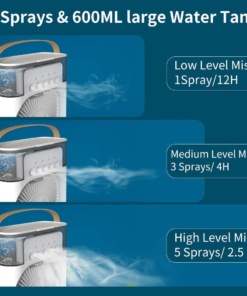 Ez a forgófejes készülék egyenletes hideglevegő-keringést biztosít, a három sebesség pedig lehetővé teszi a hűtés testreszabását. Csendes működésével, lengő üzemmódjával és jégfunkciójával kényelmet és rugalmasságot nyújt. Újratölthető akkumulátorral működik a hordozhatóság érdekében, és ideális különböző környezetekhez. A hatékony levegőhűtéshez vízpermet technológiát használ.
