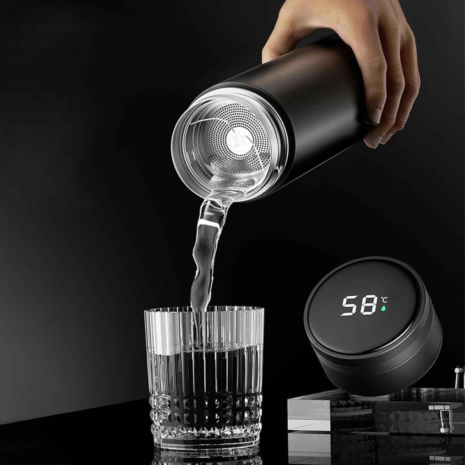 🔥❄️A kijelzőnek köszönhetően szabályozhatja az ital hőmérsékletét . A túl forró tea már nem fog meglepni! A hőmérsékleti információkat a fedélen találja. A kijelző érintéssel aktiválható.