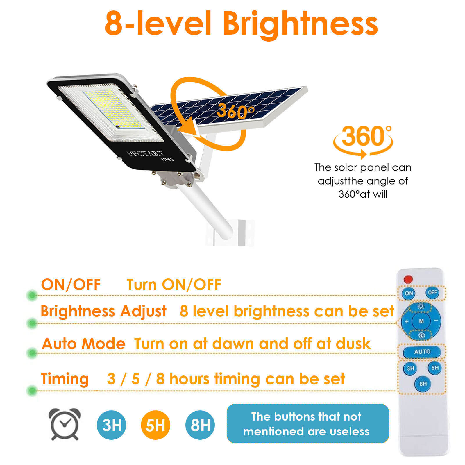 Távirányítóval vezérelhető az üzemidő (3-5-8 óra), a világítási mód (teljes fényerő, fél fényerő), valamint a be- és kikapcsolás.