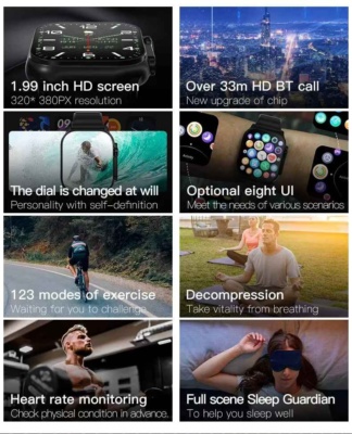 A legújabb generációs T900 Ultra 49 mm 2,09 hüvelykes, teljes érintőképernyővel (legutóbbi modellév 2023), Bluetooth-kapcsolattal, pulzusszámmal (pulzussal), vérnyomással, véroxigénnel, kalóriaszámlálás többsportos üzemmódjával és egyéb mérőszámokkal rendelkezik a különböző sportokban. , valamint a különböző típusú szabványos 45 mm-es hevederek lehetősége.